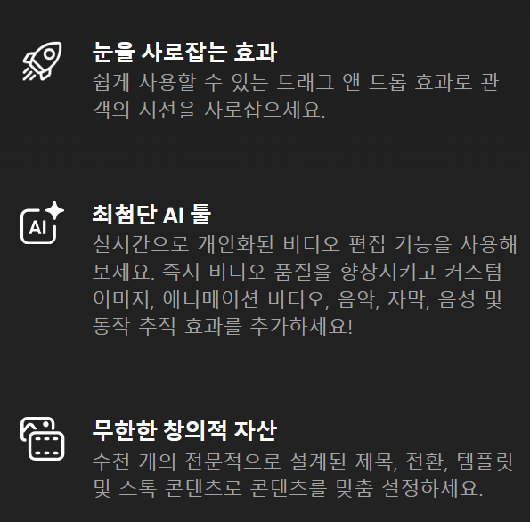 - AI 기반 도구 (자동 자막, 얼굴 흐림 효과 등)
