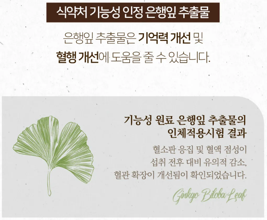 두 번째 주요 성분인 은행잎 추출물은 혈행 개선에 특화된 성분입니다:
