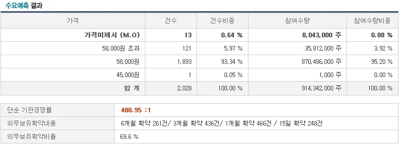 - 높은 경쟁률: 국내외 2,028개 기관이 참여해 488.95대 1의 경쟁률을 기록했습니다. 총 9억 1,434만 2,000주의 주문이 몰리며 높은 관심을 증명했습니다.