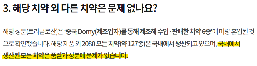 모든 2080 치약이 문제는 아닙니다. 중국 Domy 공장에서 생산되어 수입된 특정 6종만 해당됩니다. 국내 공장에서 생산된 제품은 안심하고 사용하셔도 됩니다.